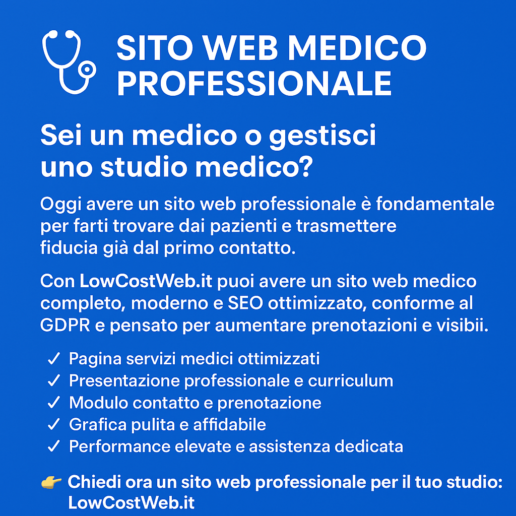 Se vuoi creare un sito web medico completo, efficace e ottimizzato, LowCostWeb.it ti offre una soluzione semplice e conveniente. Contattaci per un preventivo personalizzato e inizia subito a far crescere la tua presenza digitale.